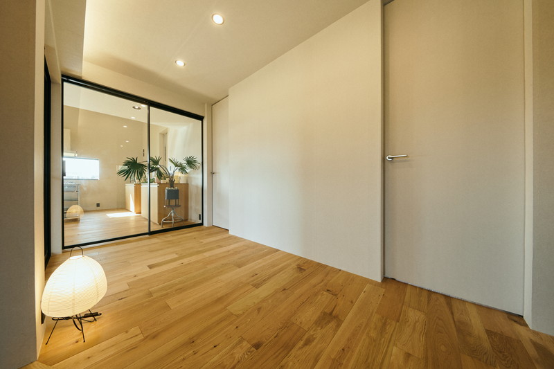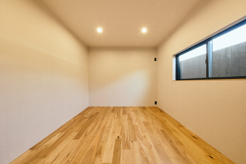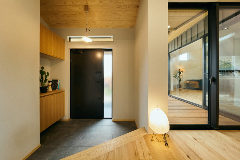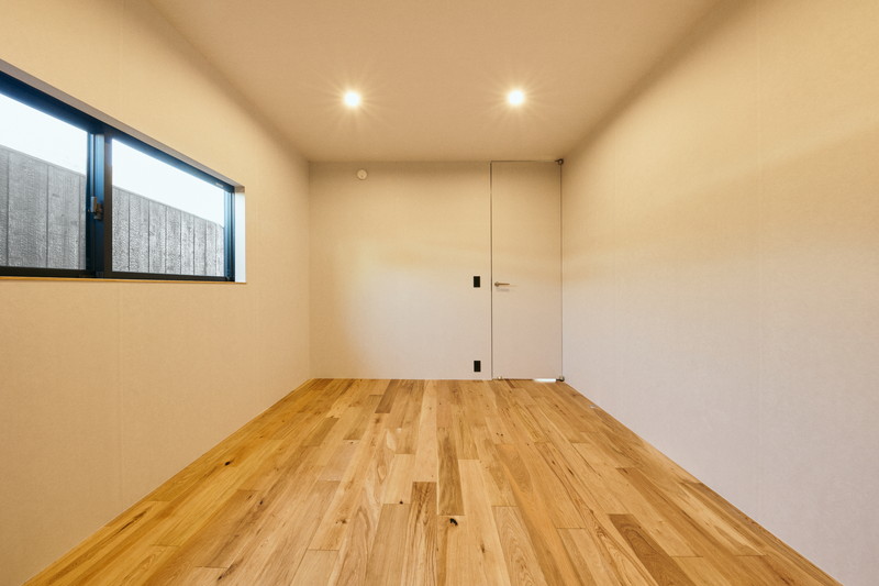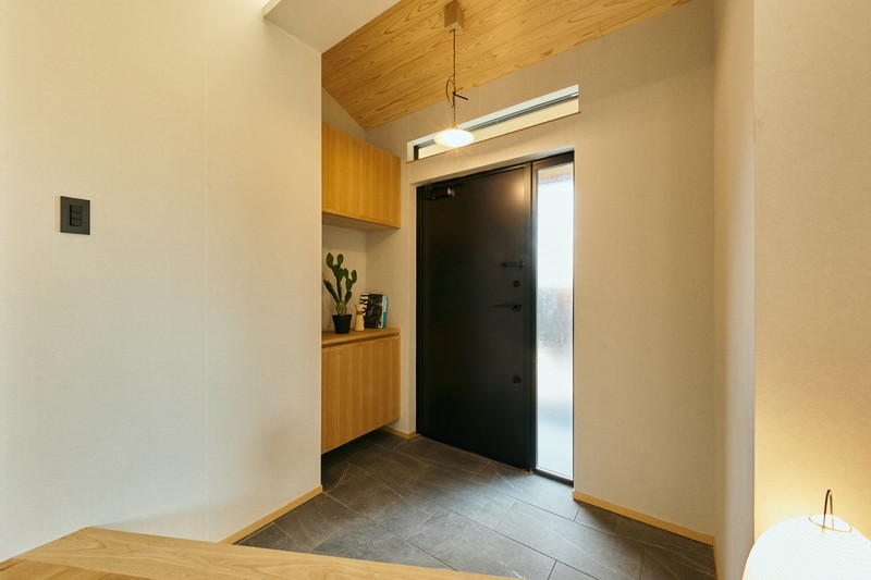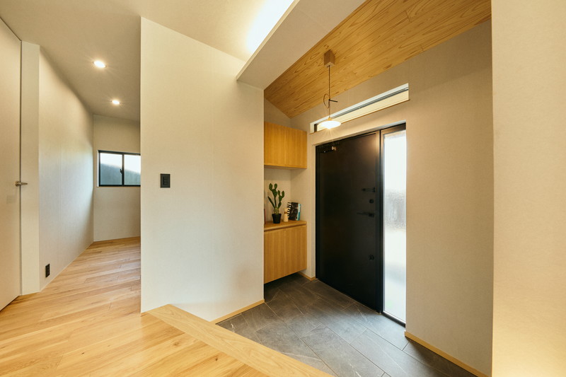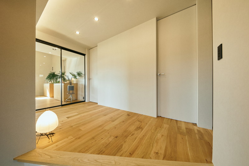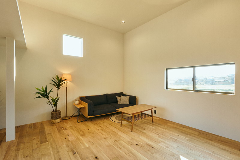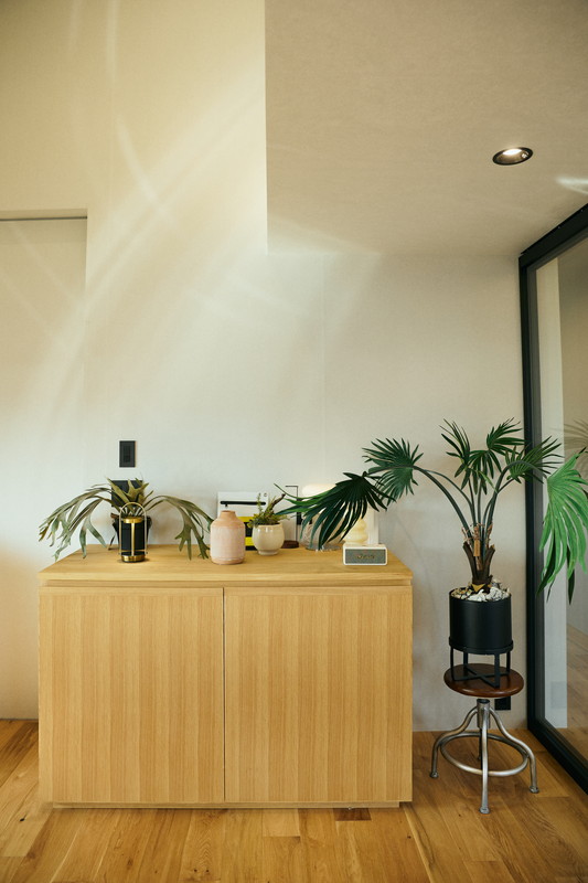 内観は床は楢材、壁は珪藻土、天井は麻を採用し、自然素材が住まいに温かみと落ち着きを与えます。